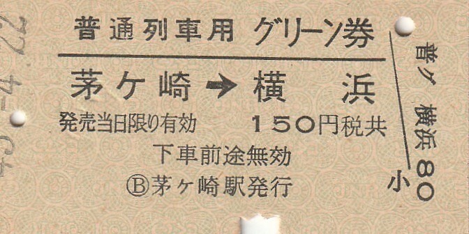 - V043.普通列車用 グリーン券 東海道本線 茅ケ崎⇒横浜 45.4.22【7668】