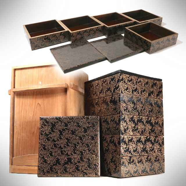 ●c073●【蒔絵五段重箱 南天小紋柄 黒地金縁内梨地 木製共箱】検お茶会煎茶道具茶懐石●西瓜●