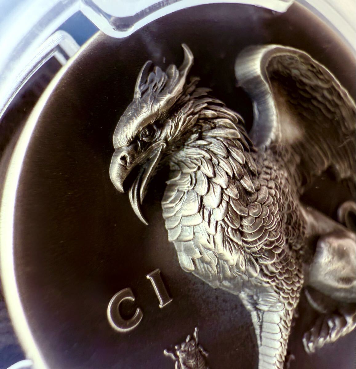 - 迫力の立体グリフォン!/2024年クック諸島/5ドル/PCGS最高鑑定SP70/初日鑑定品/古代 アンティーク仕上げ Ultra-High Relief 銀貨限定