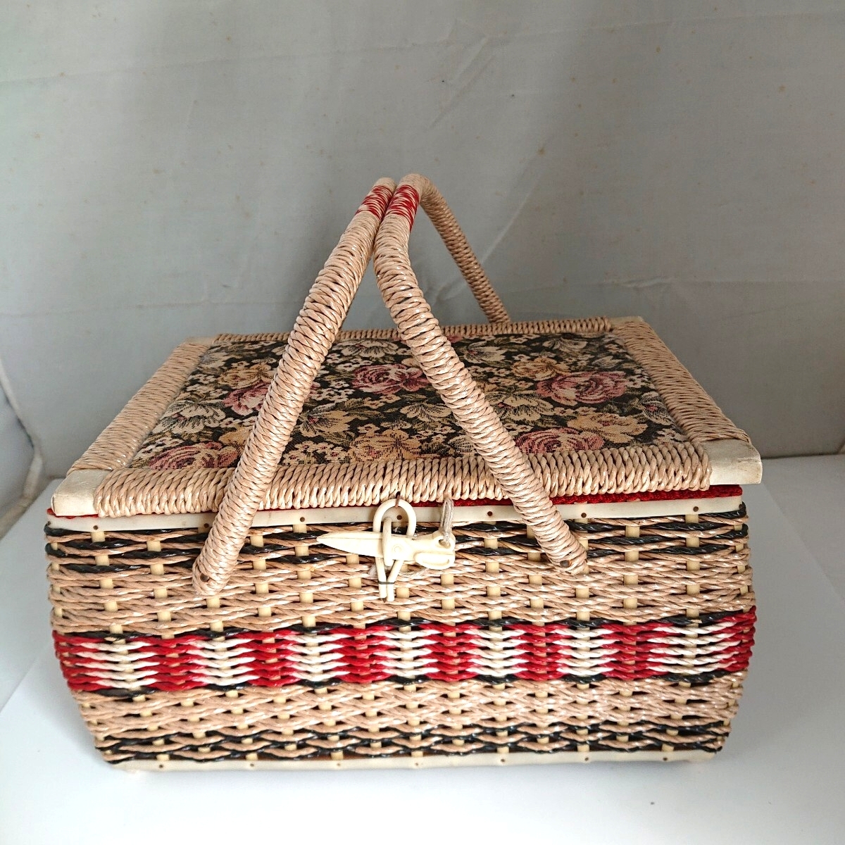 - 昭和レトロ 花柄 持ち手付 裁縫箱 ソーイングボックス 手芸箱 バスケット 当時物 現状品 ぷらみ 0926 122