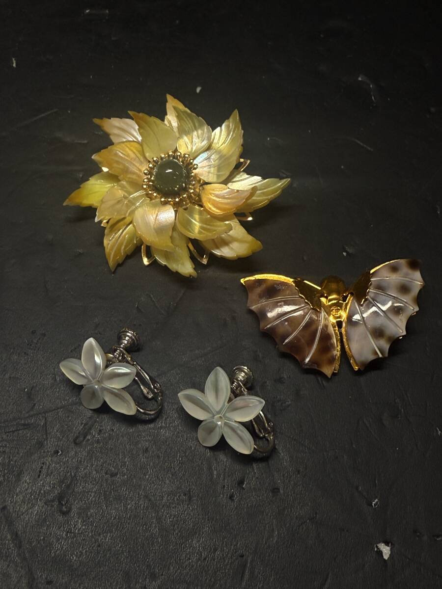 > ★コレクター必見 シェルアクセサリー まとめ ブローチ イヤリング フラワーモチーフ 蝶々モチーフ レトロ コレクション GT478