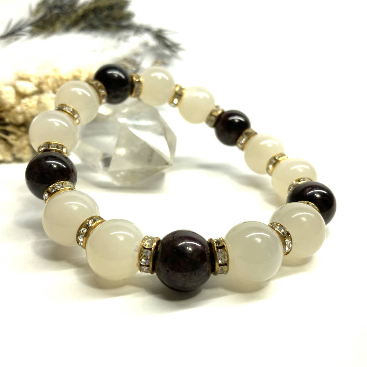 - ムーンストーン&ガーネット パワーストーン ブレスレット 天然石ブレス (ゴールド) 12mm 幸運 開運 メンズ 男性♪