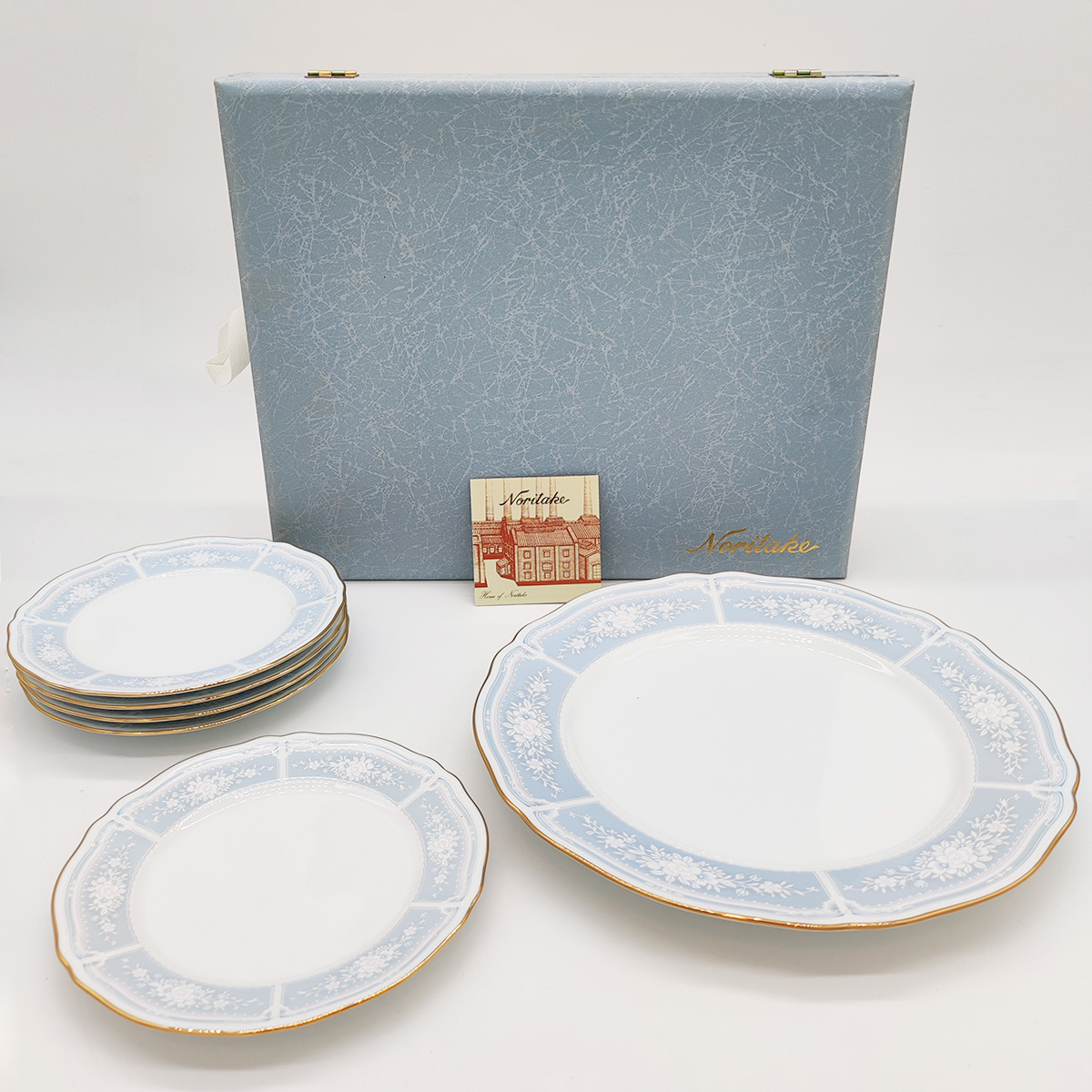 ノリタケ のケーキ皿 デザートプレートです。写真のものが全てとなります。商品に少々黒い汚れ、外箱に劣化・痛みがございます。商品状態について詳しくは写真をご確認ください。■清楚な青と可憐な白が表現された上品なシリーズ「レースウッドゴールド」。優雅なひとときを想わせるやさしい色調とフェミニンなデザインが時代を超えて愛され続ける、ノリタケを代表するシリーズのひとつです。