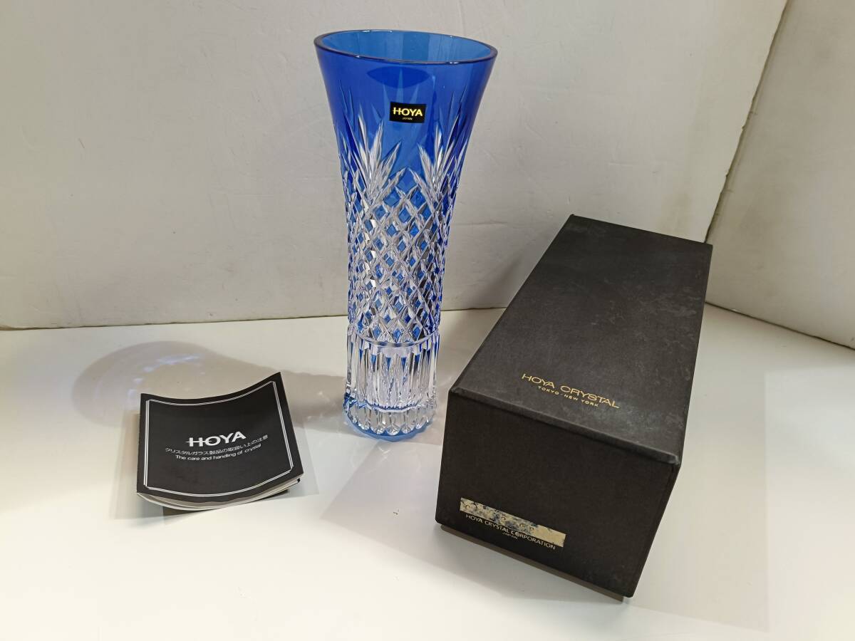 - H25757■HOYA クリスタル 切子 フラワーベース 花瓶 カットガラス ブルー 高さ20㎝ 口径7㎝/未使用保管