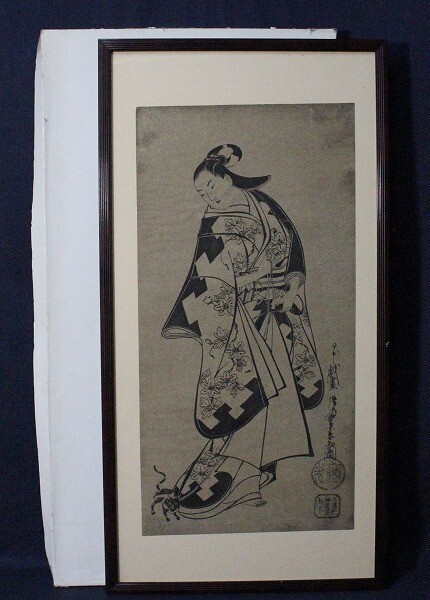 - 長陽堂安知(懐月末葉安知)「美人と猫」 木版画 初期浮世絵 錦絵 額装入 E27