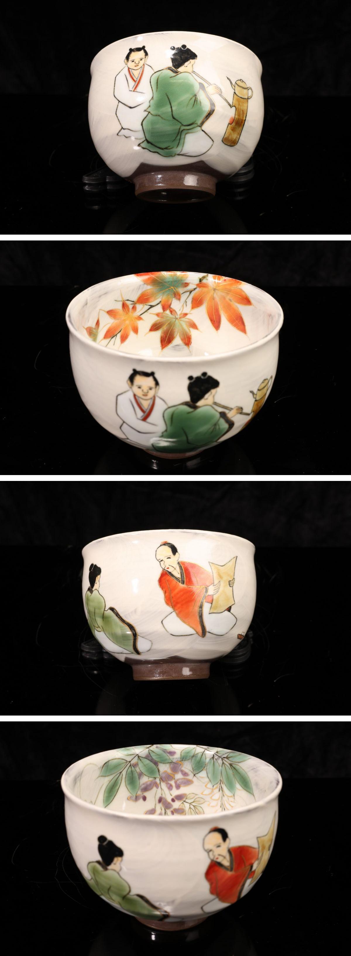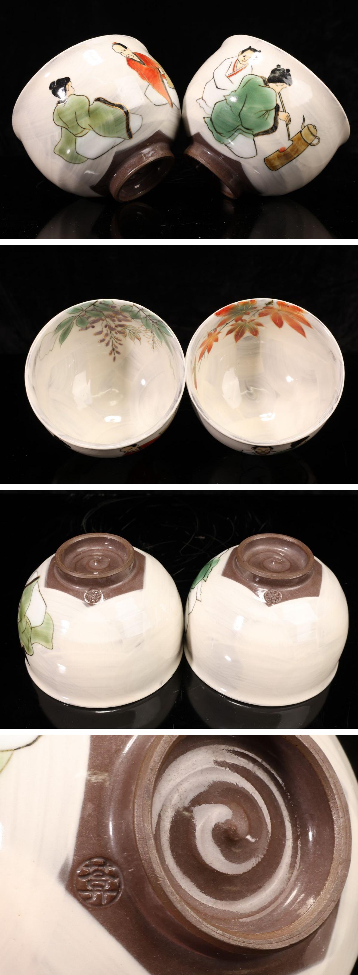 - 【珍品堂】1円から Y62-V02 京焼 清水焼 人物 文人花草 紅葉 お椀 抹茶椀 2客揃 高7cm 茶器 和食器 煎茶道具 骨董品 古美術 昭和レトロ