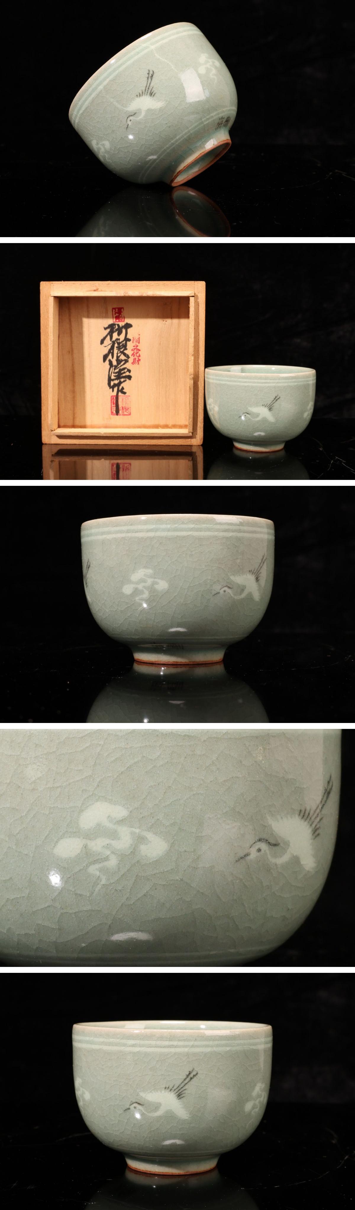 > 【珍品堂】1円から W25-V10 朝鮮人間国宝 柳海剛(柳根瀅) 高麗青磁 茶道具 高麗翡色 湯呑み 象嵌 共箱 高5.2cm 木箱 古美術 骨董品