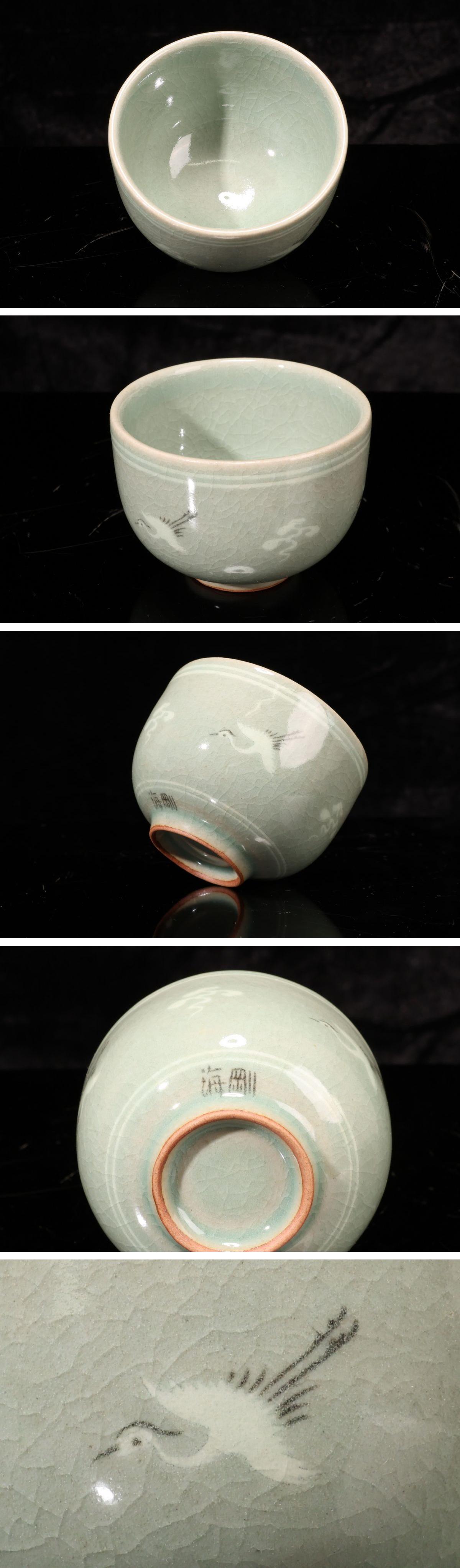 - 【珍品堂】1円から W25-V10 朝鮮人間国宝 柳海剛(柳根瀅) 高麗青磁 茶道具 高麗翡色 湯呑み 象嵌 共箱 高5.2cm 木箱 古美術 骨董品