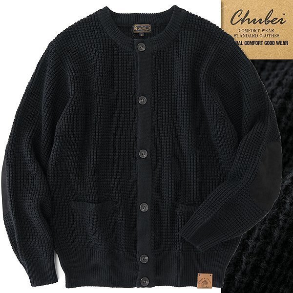 - 新品 チュウベイ 片畦編み ニット エルボーパッチ カーディガン L 黒 【CH1444333_99_L】 秋冬 CHUBEI ウール混 クルーネック 肘当