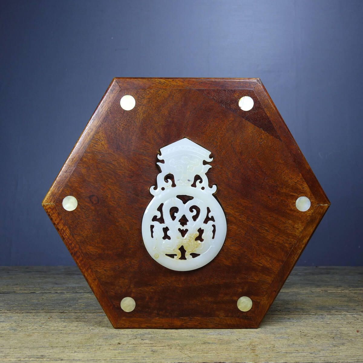 - 『館蔵珍品 花梨木 細密彫 嵌玉六角 首飾盒 置物 賞物』稀少珍蔵品 古賞物 貴重物品 収蔵品 中国古美術 時代物 古董品