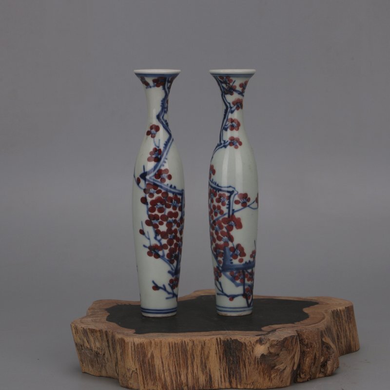 - 極美品 彩 梅花紋 花瓶 柳葉瓶 一対 花柄 陶磁器 観賞 置物 中国陶磁 収蔵品 鑑賞 中国美術品 景徳鎮 収蔵 コレクションfgcq066