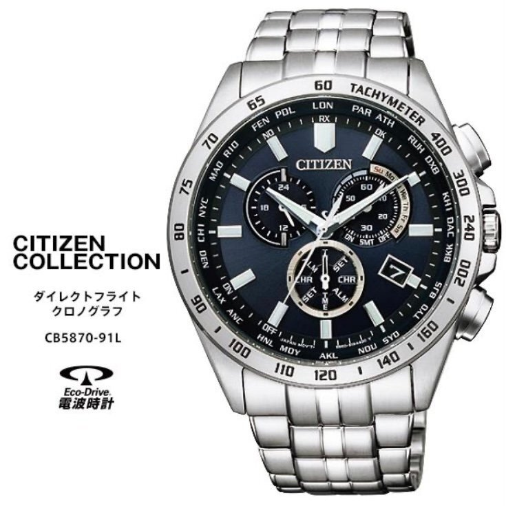 - e) CITIZEN COLLECTION シチズンコレクション エコ・ドライブ電波時計 ダイレクトフライト クロノグラフ CB5870-91L 定価60,500円 ※新品