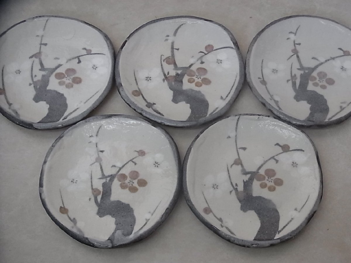 - 【未使用】 奈良県 伝統工芸 赤膚焼 (あかはだやき) 聚楽造 銘々皿 5枚揃 梅花文 共箱付 直径/14.2cm
