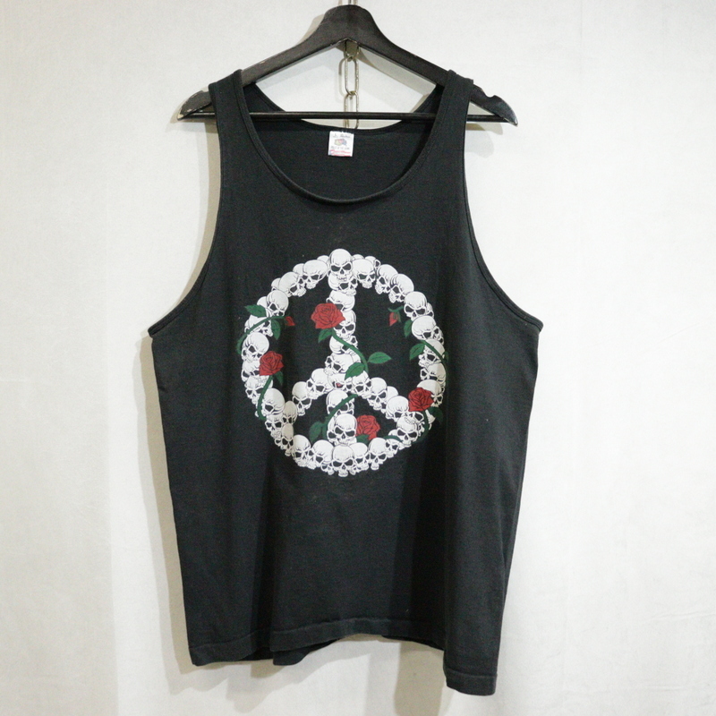 > q996 90sビンテージ フルーツオブザルーム タンクトップ USA製■1990年代製 表記Lサイズ ブラック 黒 スカル ピースマーク アメカジ 古着