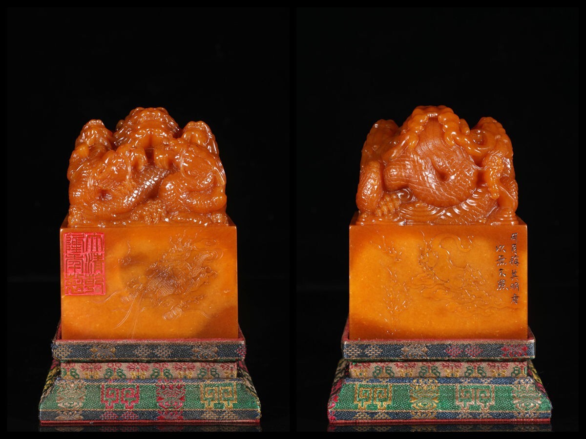 - 「清 大清乾隆年製 老寿山石 田黄石彫り 龍紋四方大印章」極細工 擺件 古賞物 中国古美術 旧蔵出