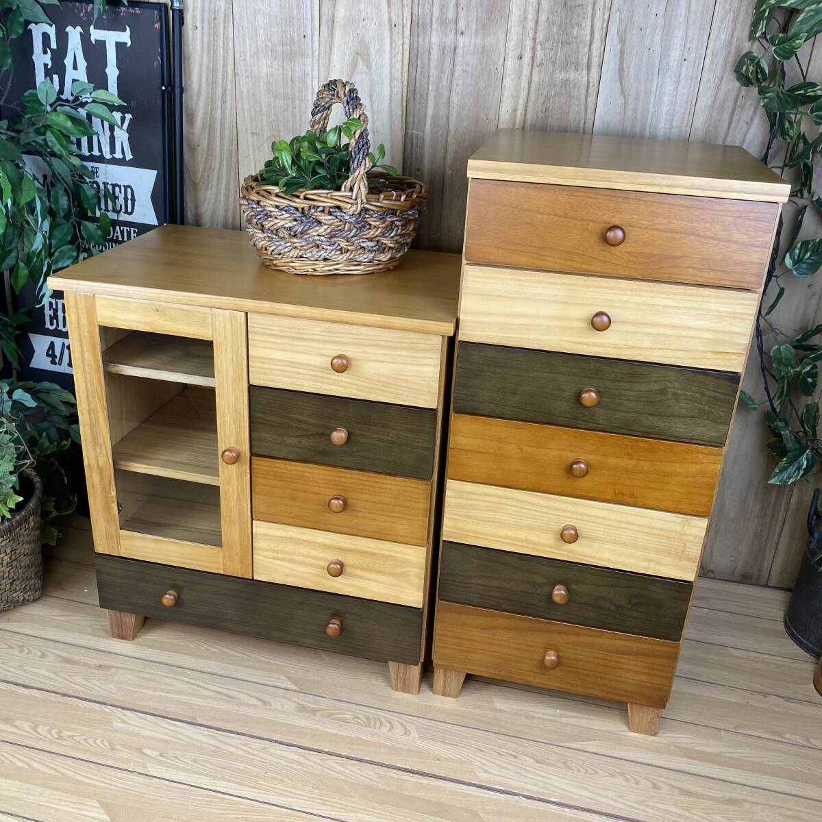 - 送料無料ナチュラルウッド桐無垢カラー多引出し七段チェスト+ガラスキャビネット、北欧カントリー調洋タンス、家具小物、収納飾り棚
