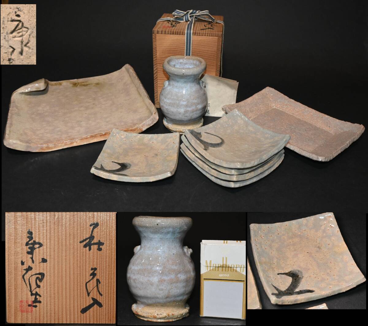 - 真作■野坂康起 作■ 萩花入/草文小皿 五客/長四方皿/四方皿 三重県生 荒川豊蔵に師事 山口県指定無形文化財 茶道具 角皿 和食器 料亭