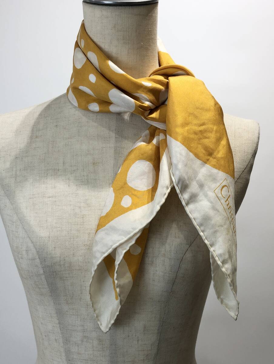 > Christian Dior 総柄 大判 スカーフ ロゴ ドット柄 オレンジ ホワイト クリスチャンディオール カレ75 古着 ヴィンテージ■0930K②