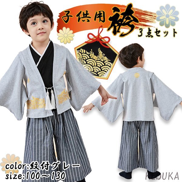 - 子供用 袴 袴風 男の子 紋付グレー3点セット 房付き 黒紋付 羽織 男の子 紋付袴 和風袴 フォーマル 子供の日 子供服 節句 端午の節句