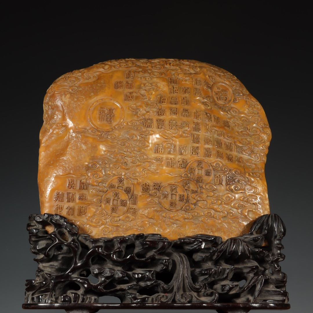 - 古石彫 寿山石 中国・清時代 【田黄石彫福寿雲紋挿屏】 文房置物 檀木台座 古美術 古賞物 唐物 時代物 重2837.8g LT-2509168