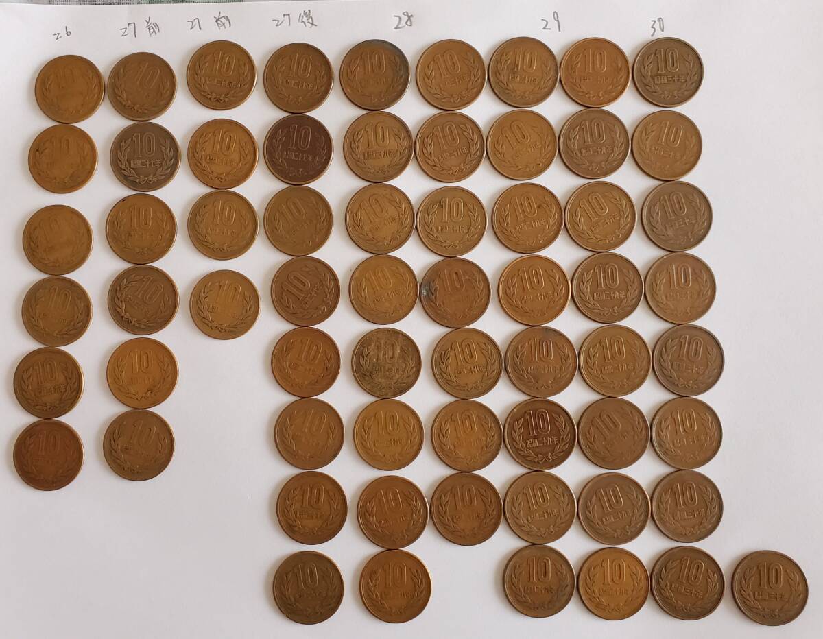 - 10円硬貨 昭和26年(6枚)27年前期(10枚)27年後期(8枚)昭和28年(15枚)29年(16枚)30年(9枚)合計64枚