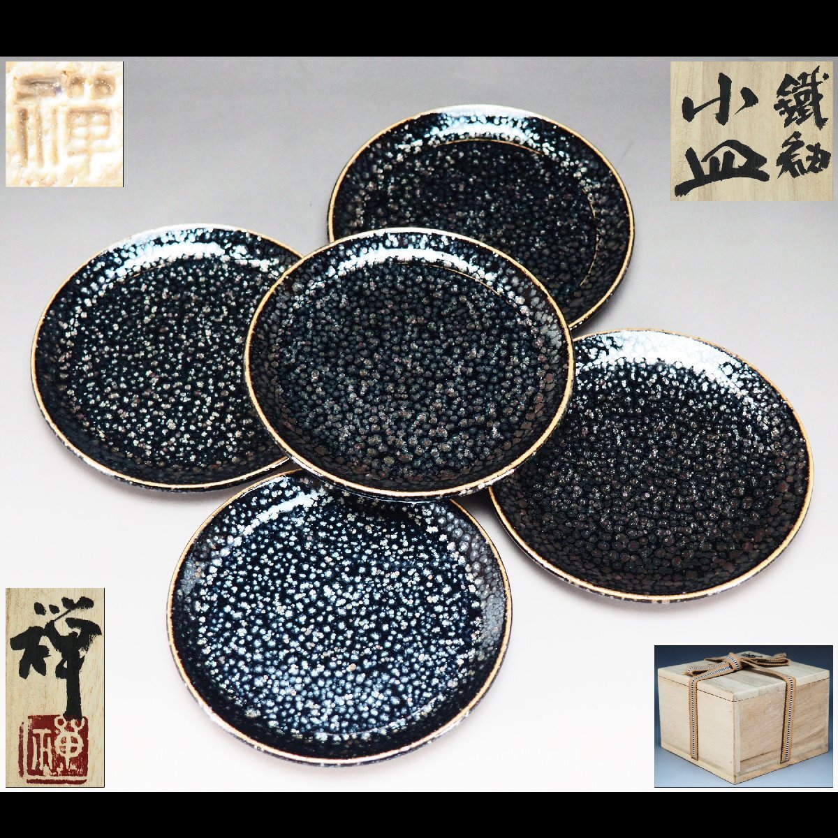 > 【治】『佐々木禅』作 鐵釉 小皿 五客揃☆共箱 幅 11cm 銘々皿 菓子皿 油滴 天目 (検索:清水卯一 木村盛和 林恭助) 本物保証 BCA323
