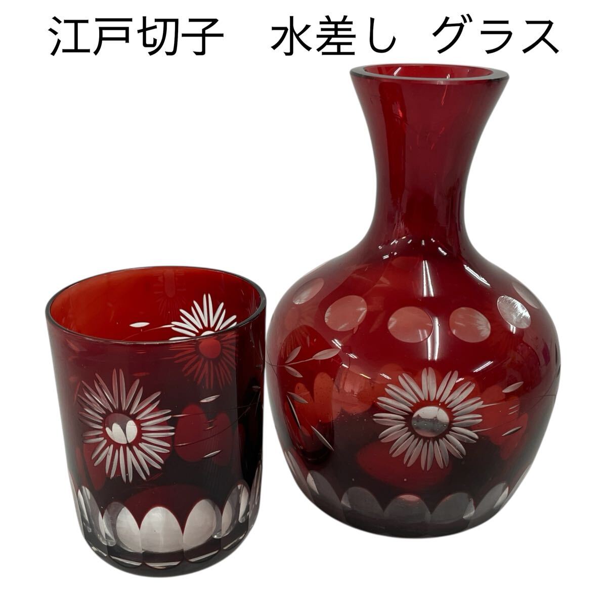 - 江戸切子 冠水瓶 花切子 水差し 昭和レトロ 赤 花紋 水注 切子グラス 花瓶 花器 レッド #0598-004R4