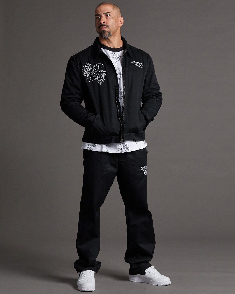 > MISTER CARTOON X RVCA JACKET BLACK M ミスターカートゥーン ルーカ フロントジップ ジャケット ブルゾン サテンキルト ブラック 黒 刺繍