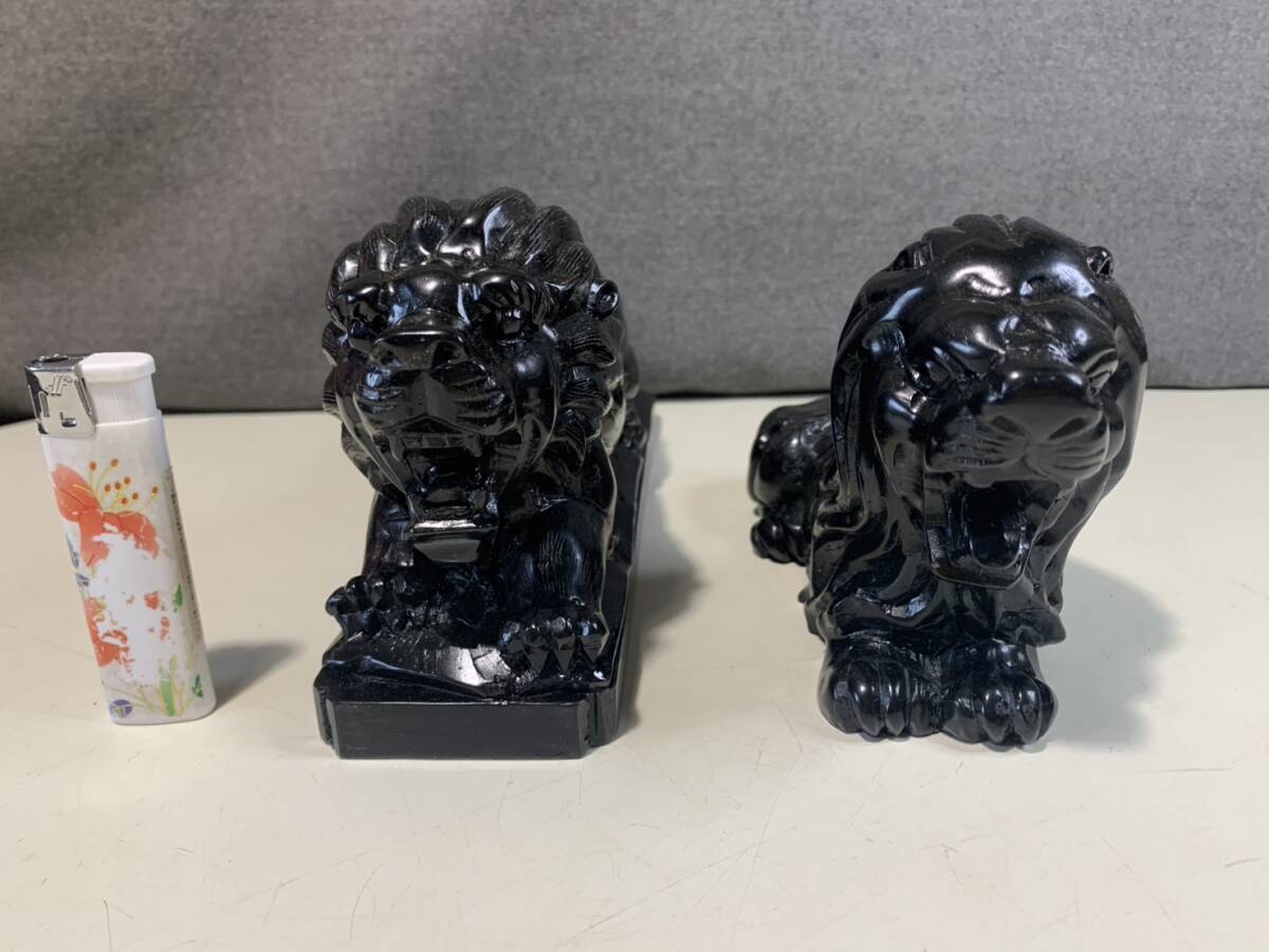 - 10K 彫刻 獅子 ライオン ペア 石彫刻 黒曜石 茶道具 書道具 盆栽具 華道具 工芸品 美術品