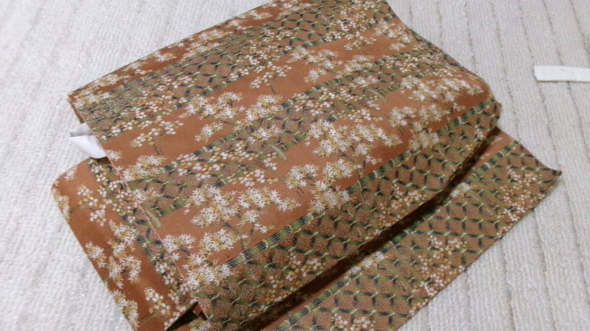 - 129【重宝】時間短縮※便利品※薄茶色紅葉模様※正絹※単衣※なごや帯※作り帯:*