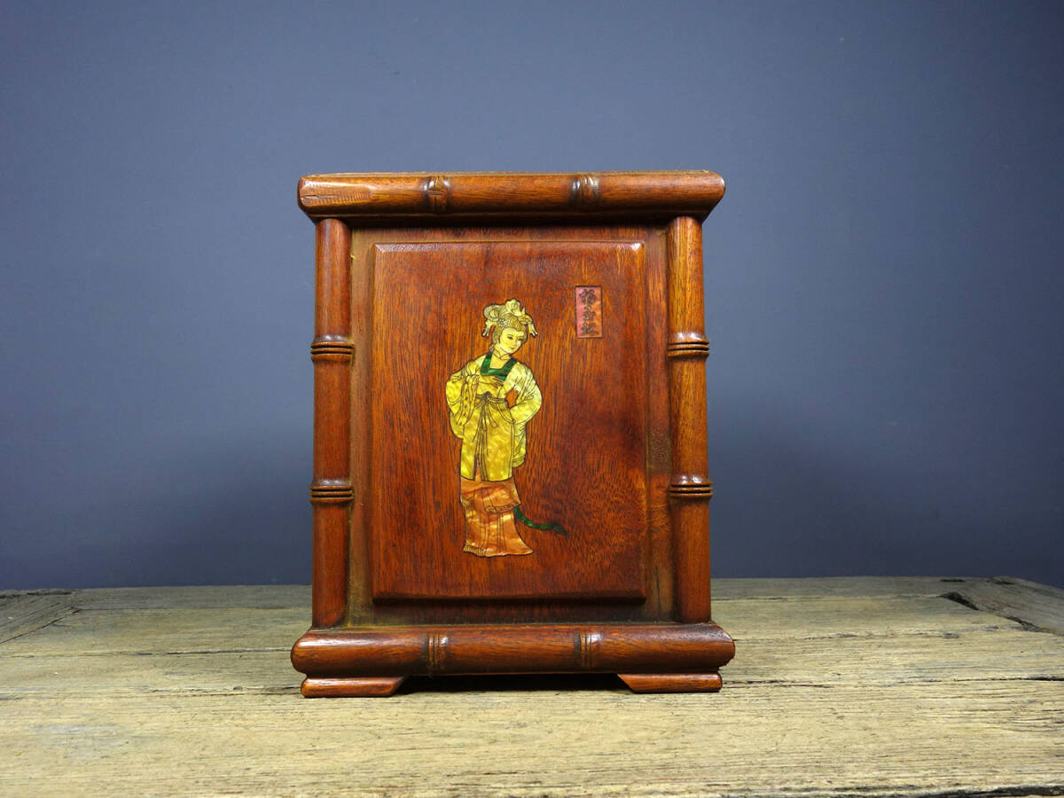 - 【蔵友館蔵品・花梨木製・細密彫・貝殼嵌・四大美女紋・四方筆筒・置物・文房賞物】・古董品・中国古玩・時代物・希少珍品・中国時代美術