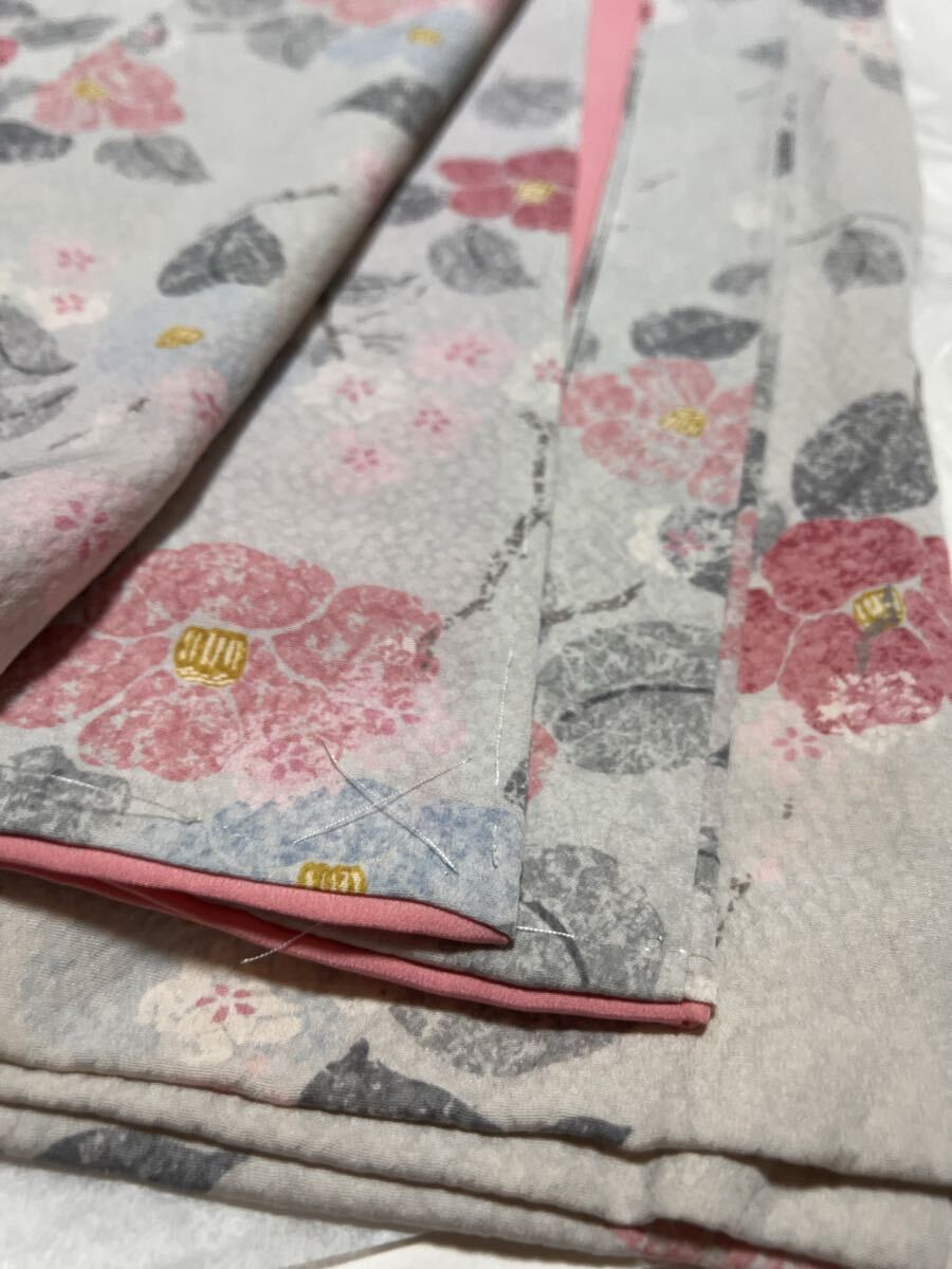 - 着物 正絹 着丈168.5cm 小紋 椿 淡色 しつけ糸付き 総柄