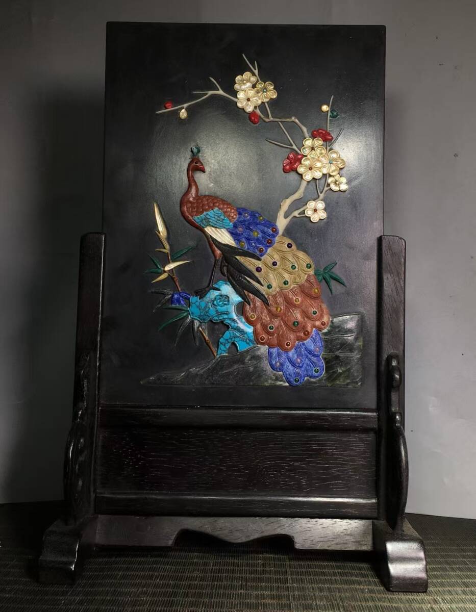 > 唐物 清時代 古檀木彫 嵌 多寶玉石 屏風 時代物 骨董 極細工 古美術 古置物 木製 東洋彫刻 古賞物 中国古玩102