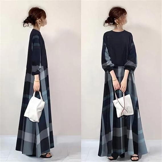 - L チェック柄 配色 ランタンスリーブ ボタン Aライン ナチュラル ワンピース