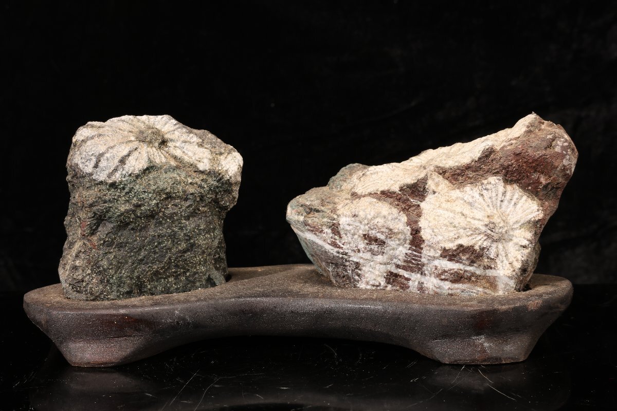 > 【珍品堂】1円から W44-V01 鑑賞石 菊花石 台付 天然石 原石 菊紋石 紋石 時代物 長21cm 幅8.5cm 高9cm 重988g