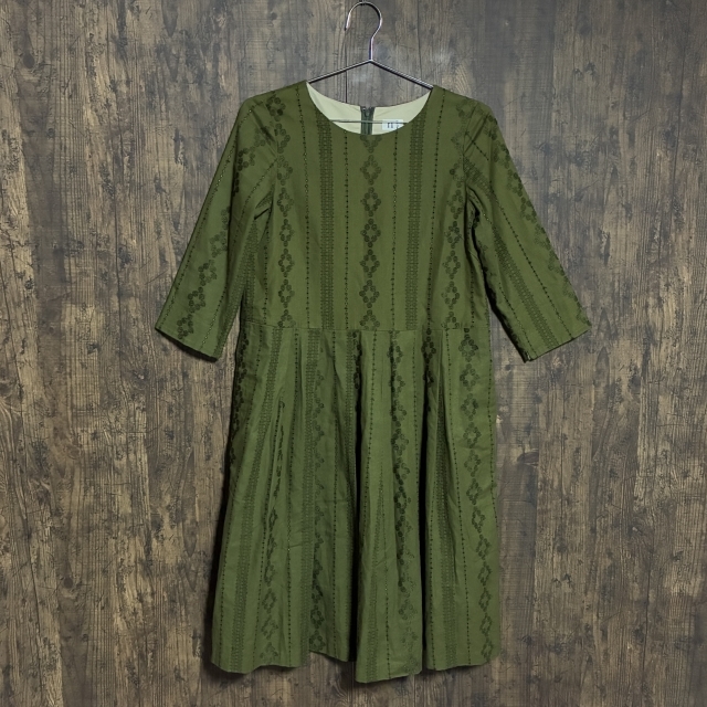 - C40◇NUMPH | ヌンプ 七分袖刺繍デザインワンピース カーキグリーン レディース 2サイズ 中古品