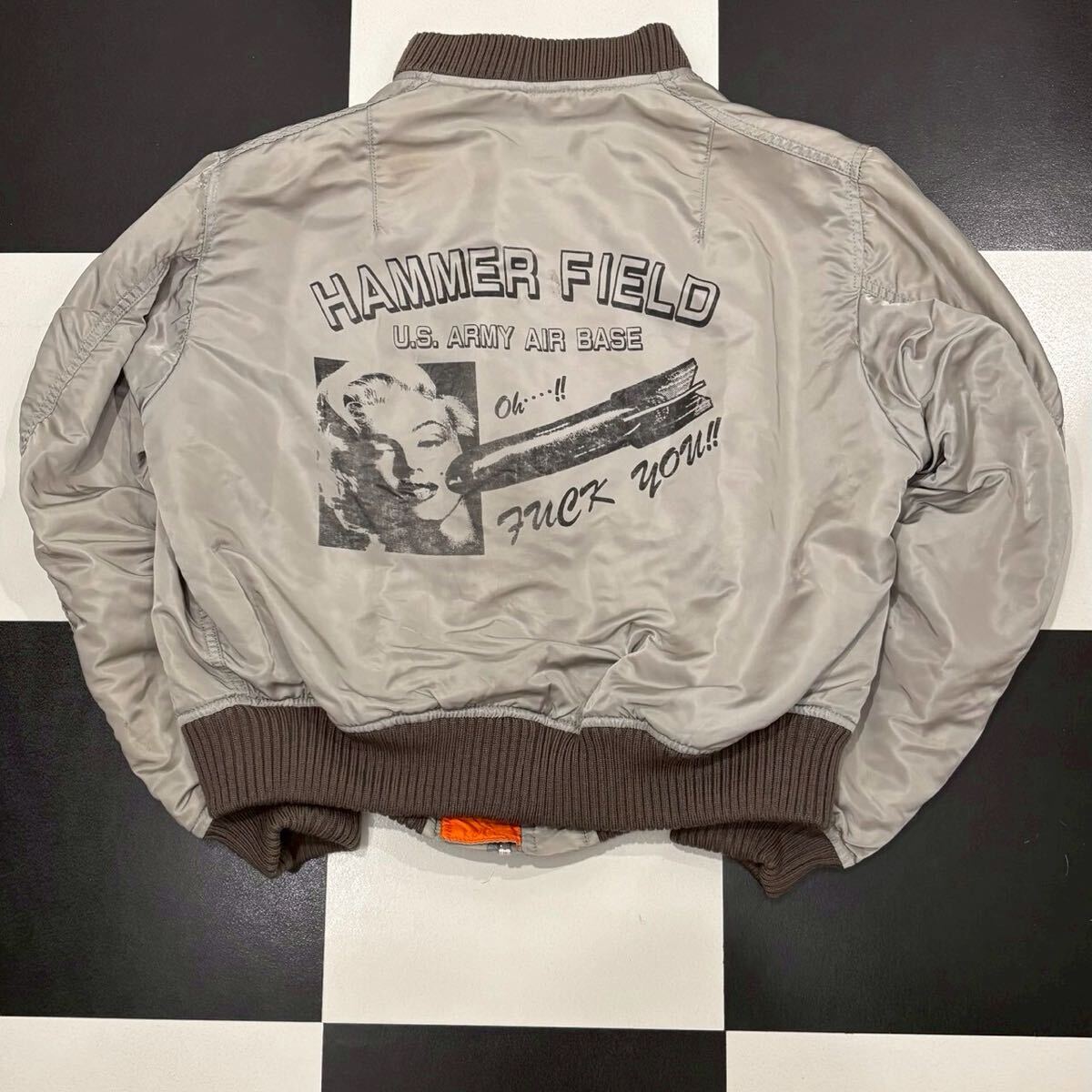 > 【651】 希少 80s アメリカ 製 alpha マリリンモンロー FUCK YOU バック プリント MA-1 フライト ジャケット XL シルバー アルファ USA 銀