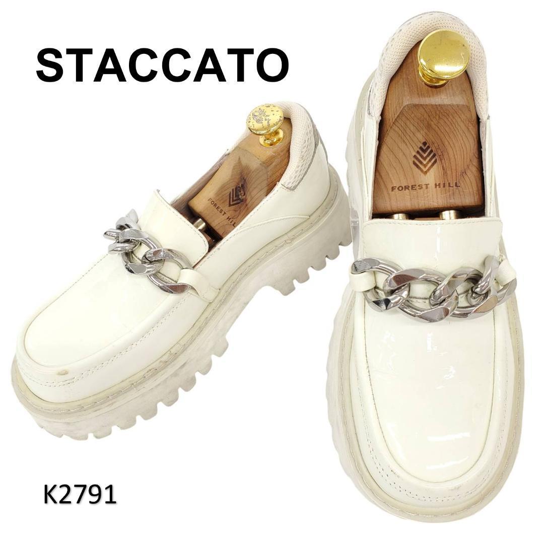 - スタッカート ローファー 厚底 エナメル 金具 チェーン ホワイト 22cm