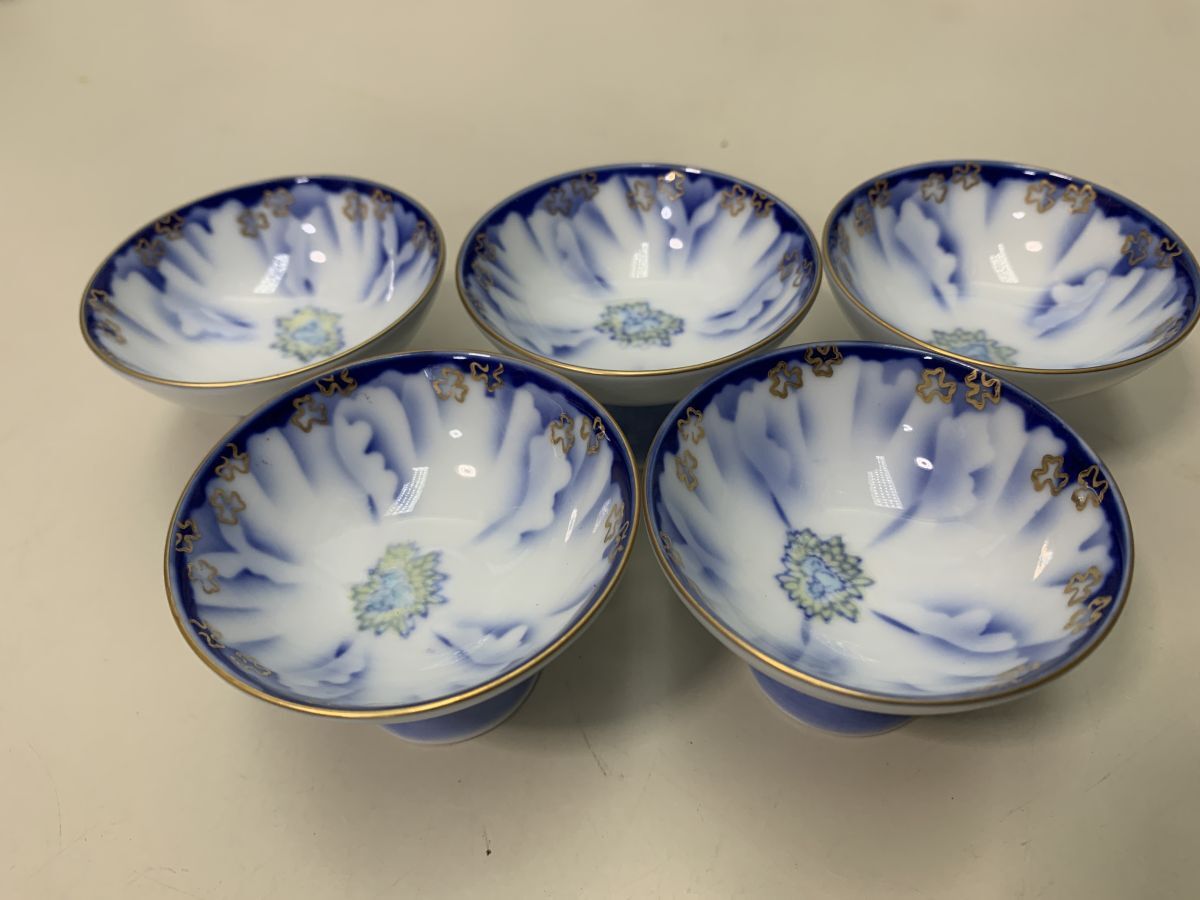 - S1-8-4→深川製磁ブルー、お猪口 湯呑み 5点セット 茶道具 陶磁器