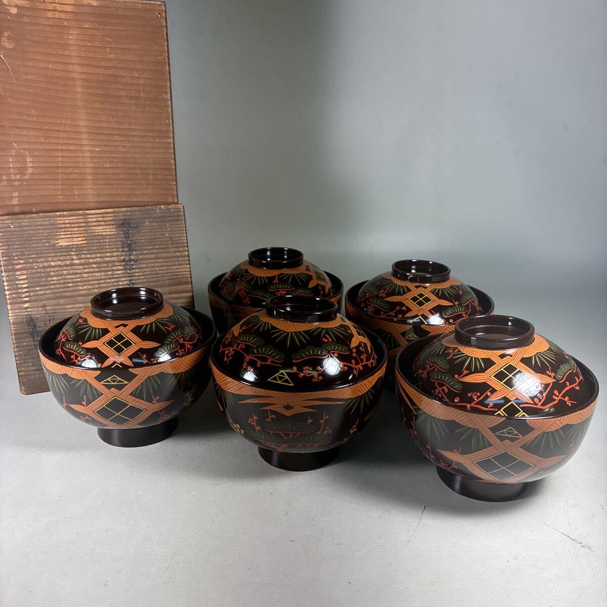 - 五代中村宗哲造 会津漆絵吸物椀 5客揃い 共箱 吸物椀 漆器 蒔絵 蓋付 お椀 汁椀 懐石道具