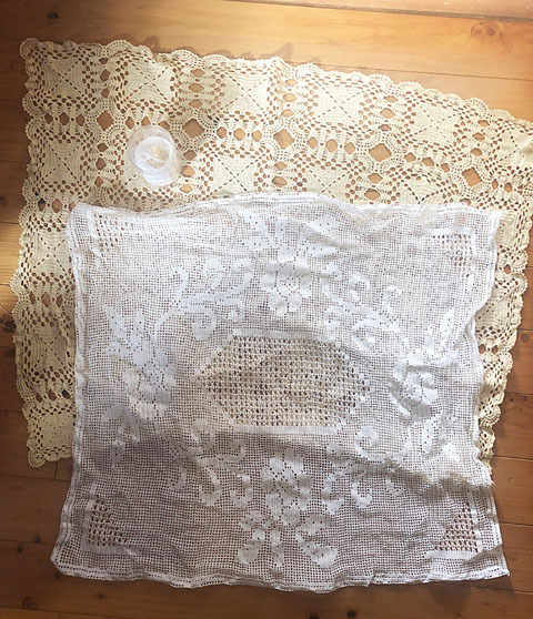 - ★レース編み★手編み★テーブルクロス/クリーム色:長辺98cmほど:編みかけ1辺67cm程★