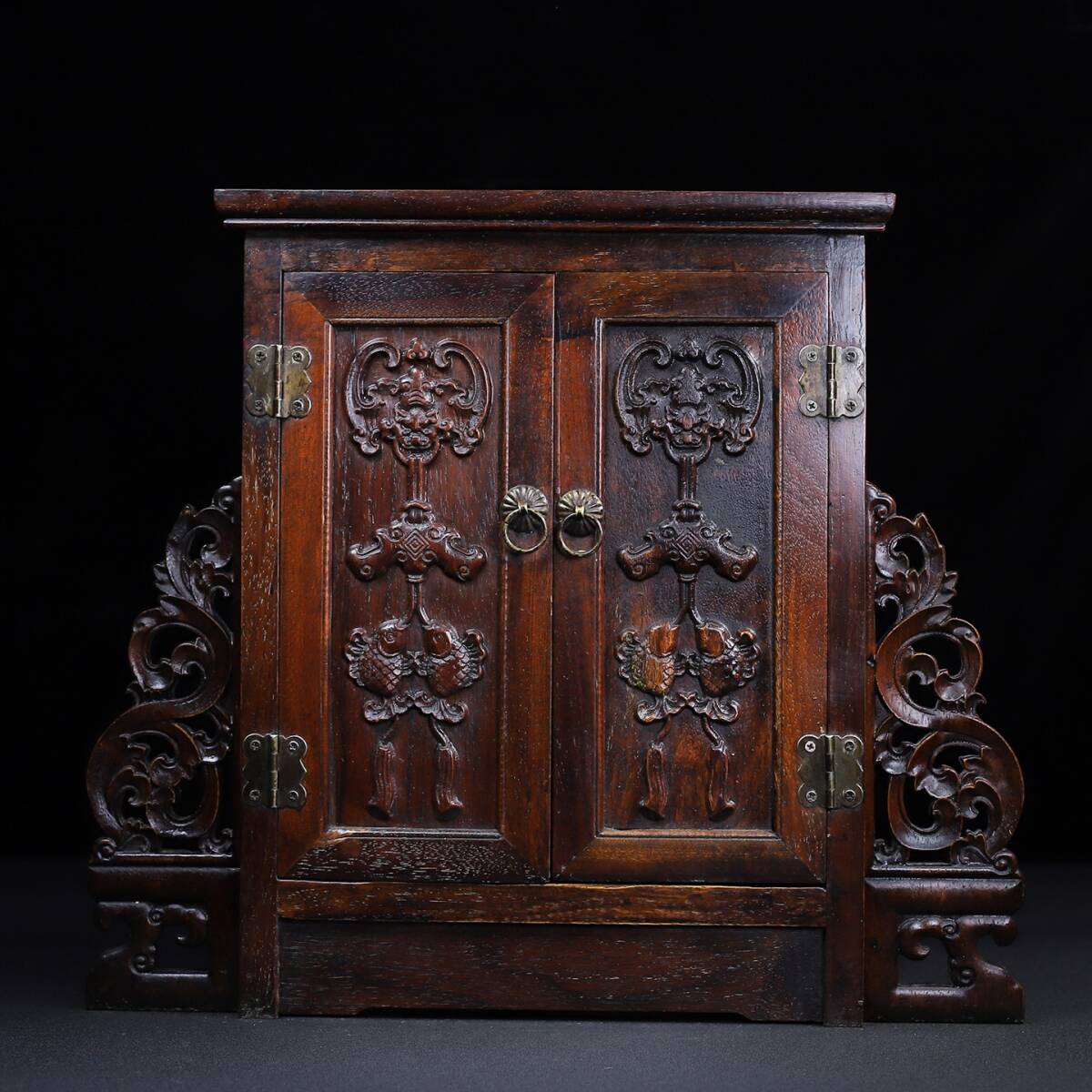 - ▽鴻▽ 花梨木製 細密彫 富貴有餘 對開門 多寶櫃 置物 文房賞物 古賞物 古董品 時代物 稀少珍品 中国古玩 中国古美術