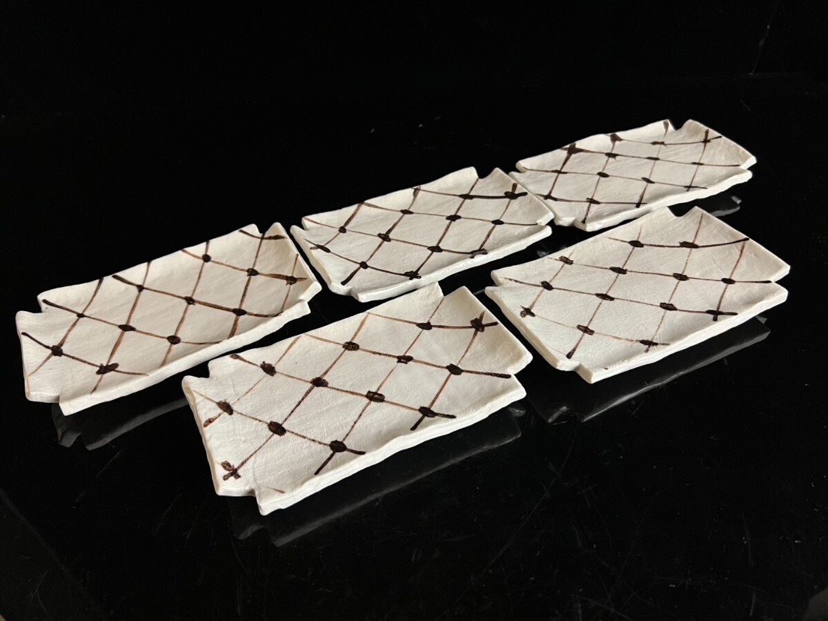 - 本物保証 魯山人 網目長方皿 向付 三足 五客揃 ロ印 共箱 共布 陶々庵箱裏書き 本物返品OK 250920−11