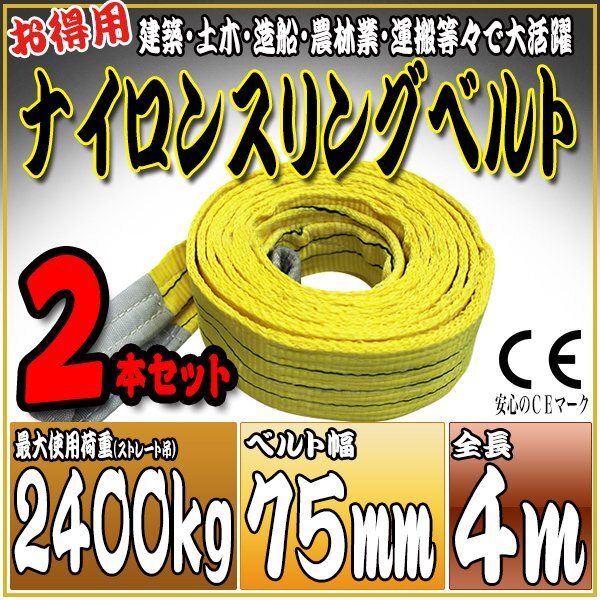 > スリングベルト2本セット 4m 幅75mm 使用荷重2400kg 2.4t 吊りベルト ベルトスリング [ナイロンスリング 吊上げ ロープ 牽引 運搬]