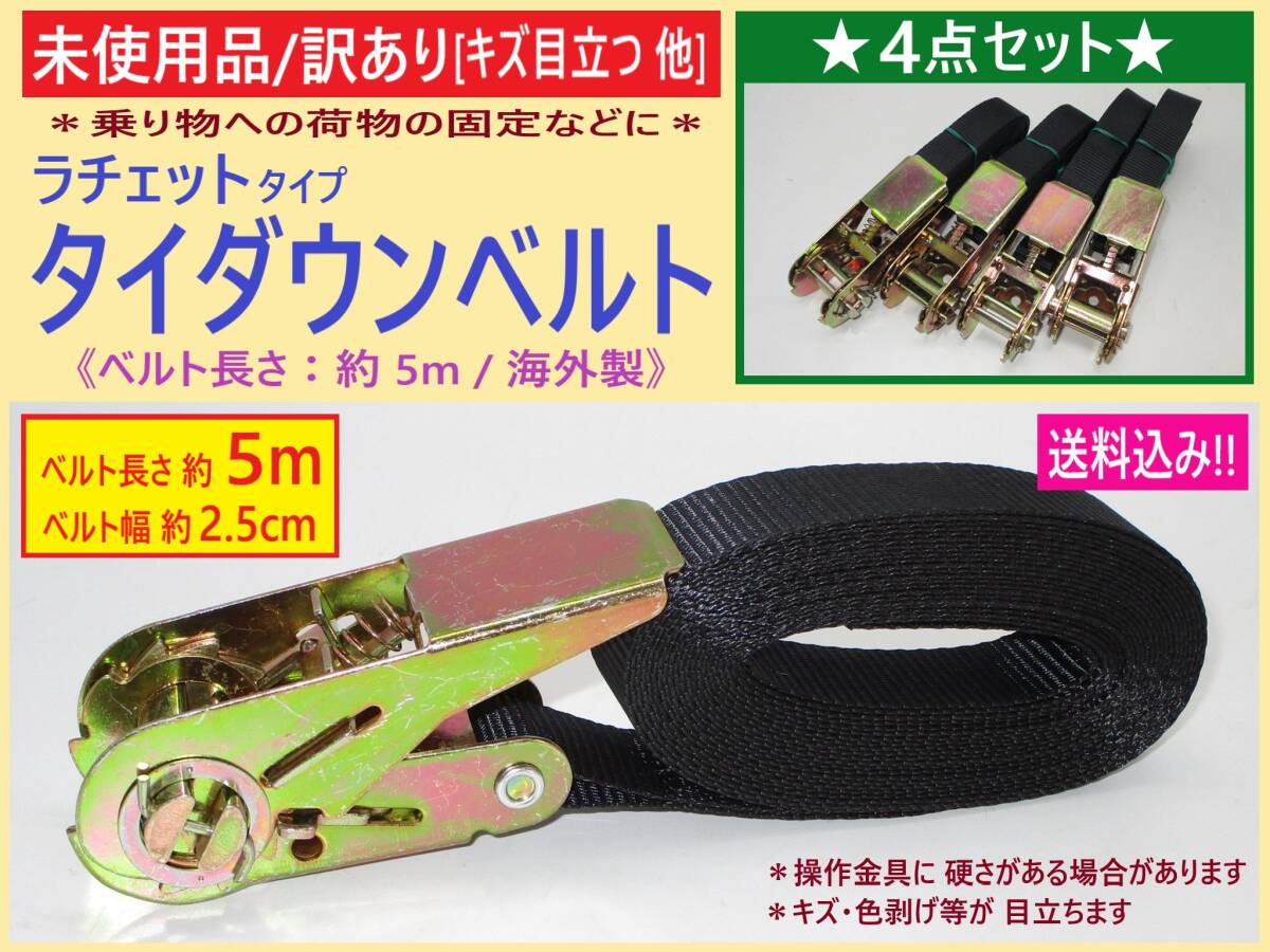> 訳あり 未使用 ラチェット タイダウン ベルト 4本 B キズ目立つ 5m 2.5cm幅 ブラック 黒 荷物 固定 ストラップ 車 バイク 自転車 海外製