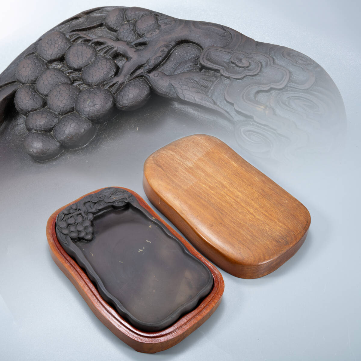 - BR2766-中国硯 端渓硯 麻子坑 彫花鳥文硯 唐木箱付 書道具 唐物 硯本体17.5X10.2cm高2.4cm