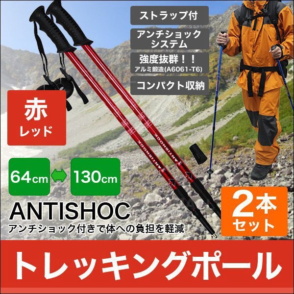 > 2本セット トレッキングポール ステッキ 杖 アルミ製 アンチショック機能付 ステッキ スティック トレッキング ウォーキング 登山 赤