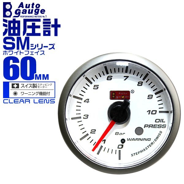 - オートゲージ 油圧計 オイルプレッシャー 60mm SM スイス製ステップモーター オープニングセレモニー ワーニング機能付 ホワイト60SMOPW