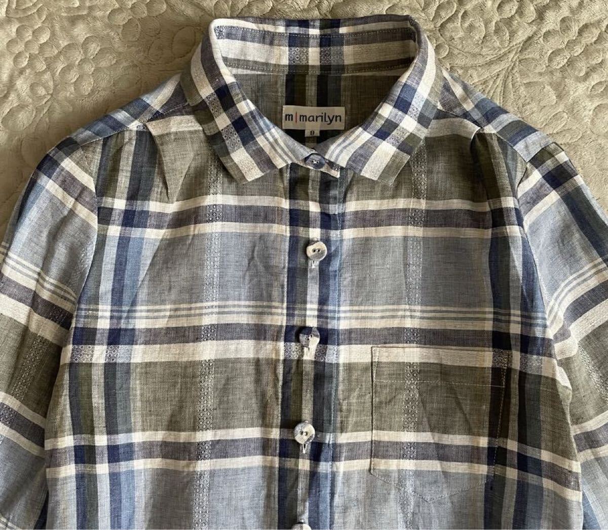 - m marilyn麻100%ワンピース チェック イタリア製生地ハーフボタン共布ボタン青グレー紺シャツワンピ リネン エムマリリン 日本製 9