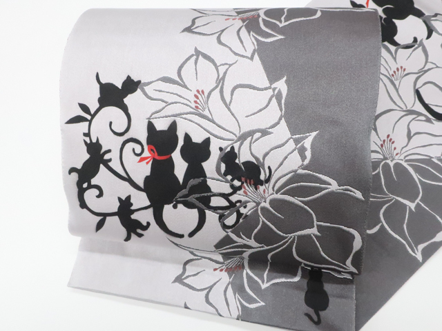 - 《古美術京松》リサイクル着物 八寸名古屋帯 お太鼓柄 花に猫 ネコ sok7b09-38